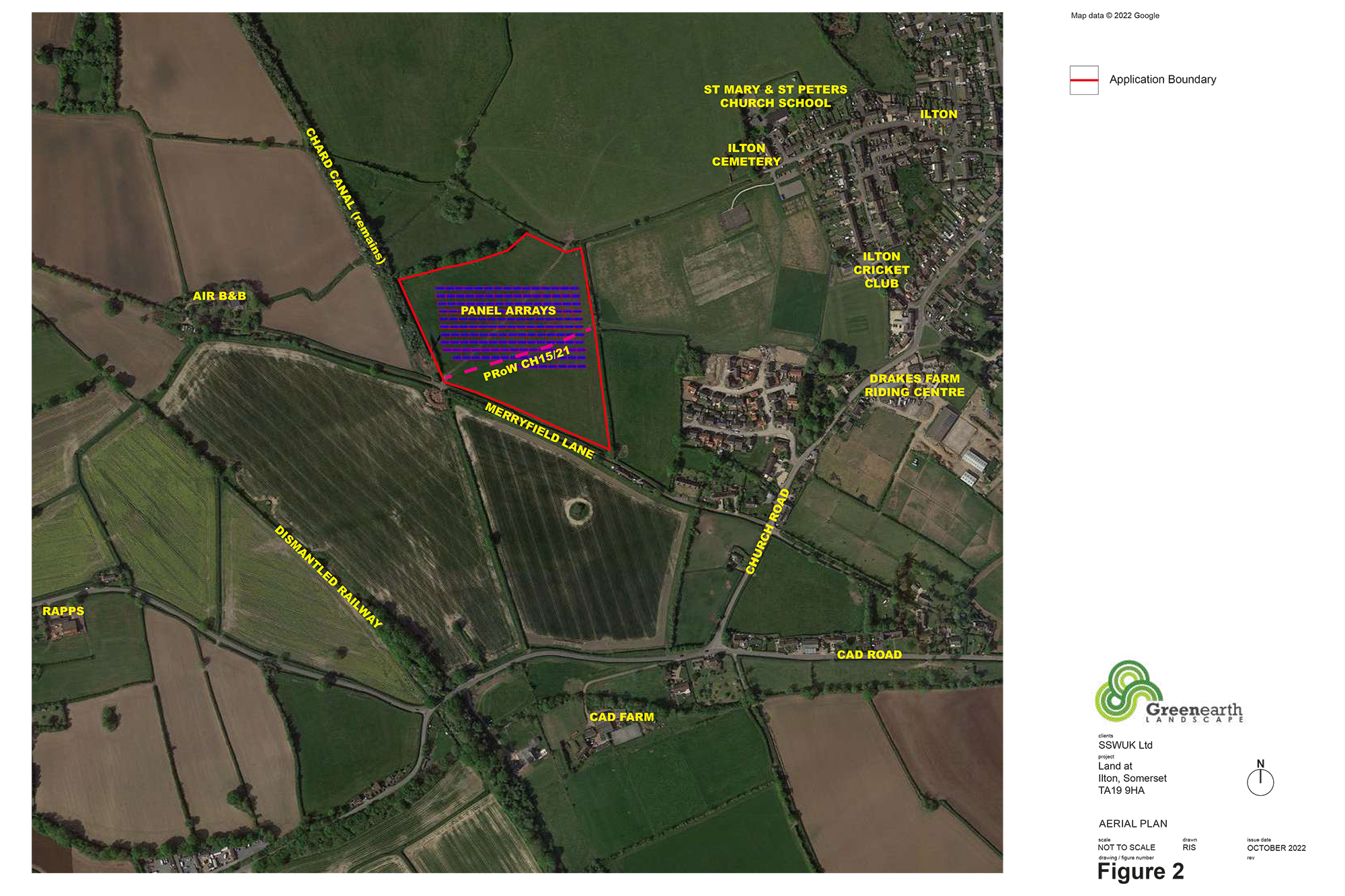 Greenearth Landscape produced an LVIA for this small solar farm on the edge of the village of Ilton in Somerset. The site has inherent sensitivity as it is crossed by a public right of way that is used extensively by residents of the nearby Ilton village. The assessment considered the baseline situation and likely landscape and visual effects, including the impact on views experienced by users of the footpath. The proposal was granted planning permission in December 2023 and construction of the installation is now complete.