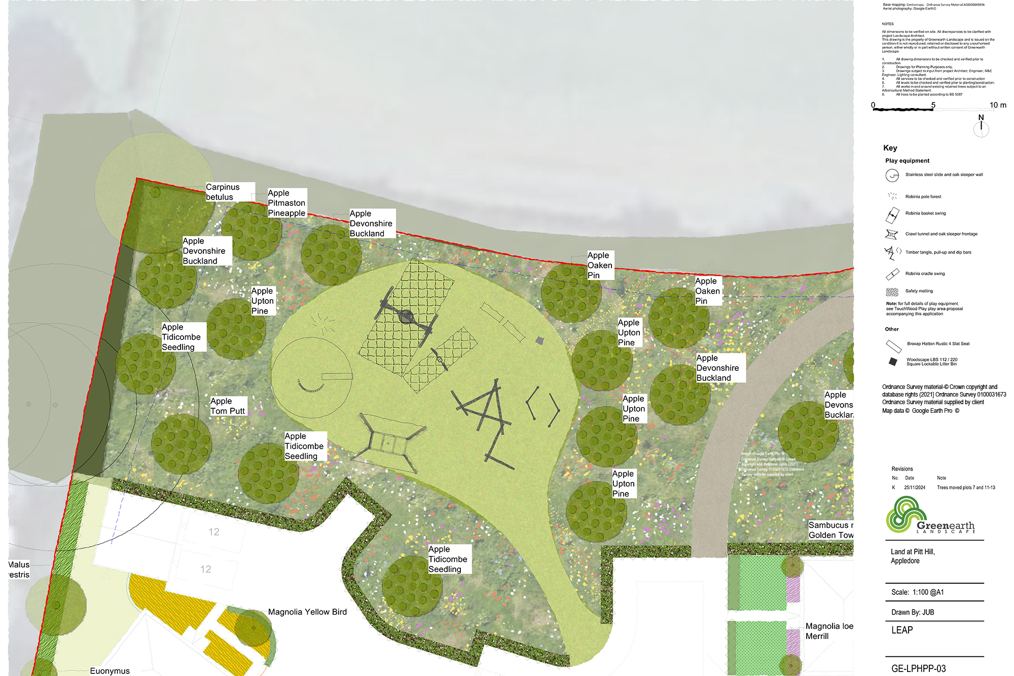 This site is located in a visually sensitive hilltop location on the edge of Appledore in North Devon. The site is located in a ‘green gap’ between Appledore and Northam and is seen from points on the opposite side of the Torridge estuary and from Tapley Park Registered Park and Garden. North Devon and Torridge Council were concerned that the development would create coalescence and create adverse visual effects so Greenearth were engaged to produce LVIA looking at the likely effect of development on views from the surrounding area. Informed by this study we developed a landscape scheme that included strategic tree planting that would mitigate these effects while still maintaining the existing housing numbers. The scheme also included multi-functional green space with native tree and shrub planting and wildflower meadow seeding as well as a wetland area with wetland planting. Amenity, play and orchard areas were also important elements in the scheme and a natural style play area and an orchard planted with local heritage varieties of apple were included within the public open space.